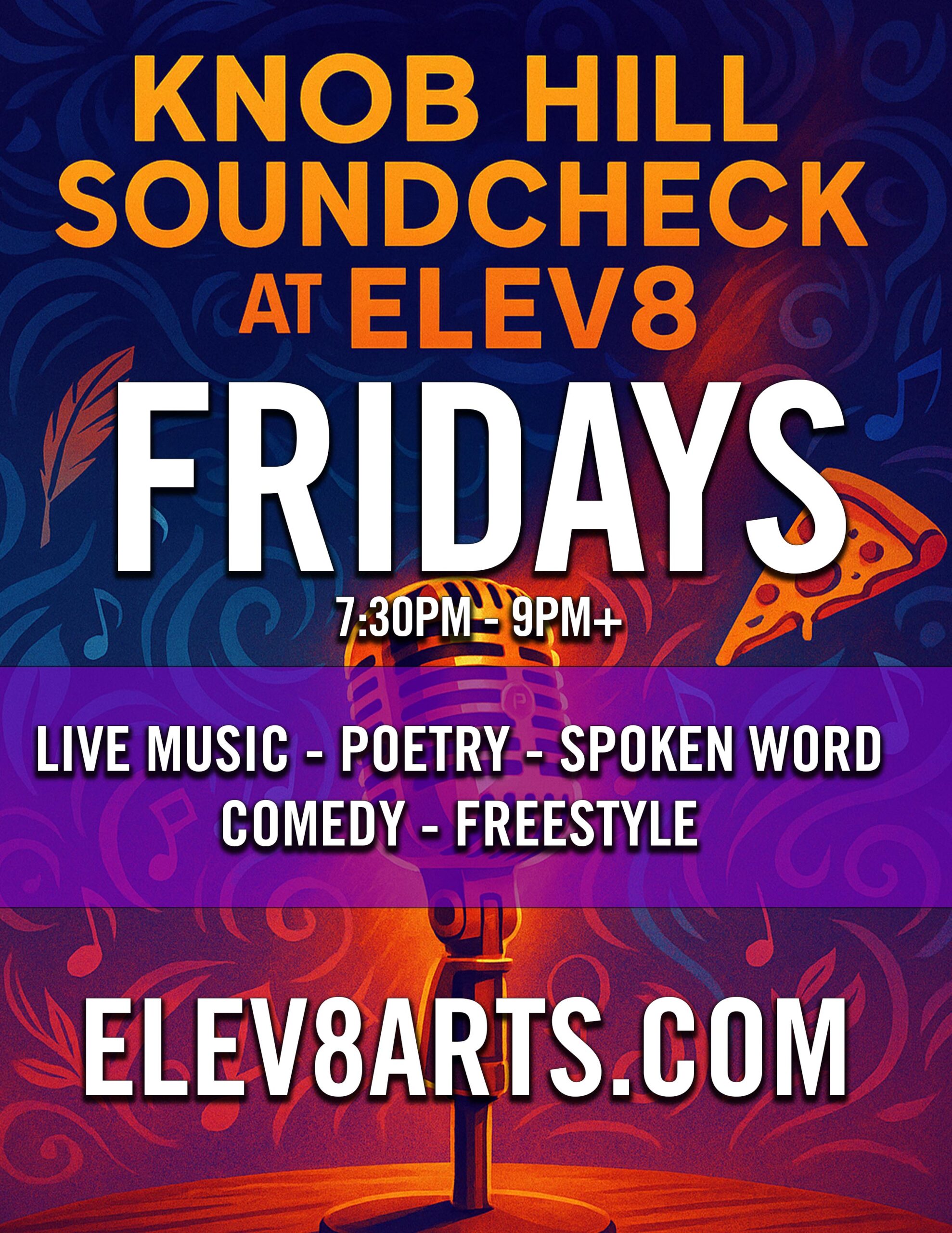 Join us every Friday from 7:30 to 9:30 pm for Knob Hill Soundcheck @ Elev8, a community-powered open mic night welcoming all forms of creative expression. Music, poetry, comedy, freestyle jams, and more. Whether you’re performing or just vibing, this is the spot.